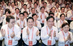 28일 인천국제공항공사 항공교육원에서 열린 2025 국민의힘 국회의원 연찬회에서 장동혁 대표, 송언석 원내대표 등 참석자들이 손뼉 치고 있다. 연합뉴스 장동혁 국민의힘 대표는 28일 “이재명 정권의 국가 허물기와 실정을 막아내기 위해 우리가 투쟁하고 혁신 해야 한…