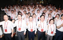 28일 인천국제공항공사 항공교육원에서 열린 2025 국민의힘 국회의원 연찬회에서 장동혁 대표, 송언석 원내대표 등 참석자들이 구호를 외치고 있다. 연합뉴스 장동혁 체제 출범 이후 처음 열린 국민의힘 연찬회는 정부·여당을 비판하는 성토장이 됐다. 송언석 원내대…