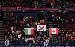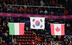 대한민국 여자 쇼트트랙 대표팀이 3000m 계주에서 금메달을 획득한 18일(현지시간) 이탈리아 밀라노 아이스스케이팅 아레나에 태극기가 계양되고 있다. 김종호 기자 2026 밀라노·코르티나담페초 동계 올림픽 쇼트트랙 종목 4번의 시상식에서 잘못된 디자인의 태극기가 …