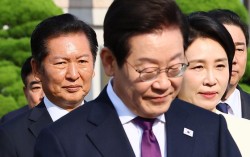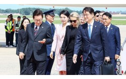 한일정상회담 참석을 위해 출국하는 이재명 대통령과 부인 김혜경 여사가 23일 경기도 성남 서울공항에서 공군 1호기 탑승을 위해 이동하고 있다. 왼쪽은 정청래 민주당 대표. 대통령실사진기자단 중앙 김현동 정청래 더불어민주당 대표의 보수 야당을 향한 ‘악수 …