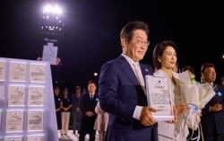 이재명 대통령과 김혜경 여사가 15일 서울 세종대로 광화문광장에서 열린 제21대 대통령 국민임명식 '광복 80년, 국민주권으로 미래를 세우다' 행사에서 '빛의 임명장' 큐브가 완성된 뒤 인사하고 있다. [사진 대통령실] 대통령 국민임명식 이후 ‘장갑차 …