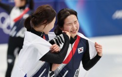 쇼트트랙 최민정(왼쪽)이 18일(현지시간) 이탈리아 밀라노 아이스스케이팅 아레나에서 열린 2026 밀라노 코르티나담페초 동계올림픽 쇼트트랙 여자 3000m 계주에서 금메달을 확정한 뒤 김길리의 눈물을 닦아주고 있다. 김종호 기자 20260218 금메달 세…