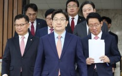 지난 3월 25일 권성동 당시 국민의힘 원내대표(가운데)가 국회에서 열린 원내대책회의에 입장하고 있다. 연합뉴스 윤석열 전 대통령에 대한 탄핵심판 선고(4월 4일)가 임박한 지난 3월 25일 당시 권성동 국민의힘 원내대표는 원내대책회의 직후 기자들에게 대…