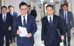 구자현 검찰총장 직무대행(왼쪽)과 유재성 경찰청장 직무대행이 26일 서울 종로구 정부서울청사에서 AI 악용 등 가짜뉴스 엄정 대응을 위한 검경 합동 담화문을 발표하기 위해 이동하고 있다. 뉴스1 6·3 지방선거를 넉달 앞두고 검찰과 경찰이 26일 AI 딥페이크 허…