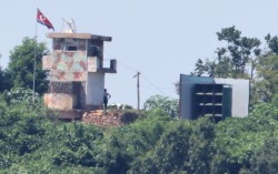 11일 경기도 파주시 접경지역에서 바라본 북한군 초소 옆에 대남 확성기가 설치돼 있다. 연합뉴스 김여정 북한 노동당 부부장은 14일 한국 정부의 긴장완화 조치에 호응한 적이 없다며 국경선 확성기에 대해 “철거한 적이 없으며 철거할 의향도 없다”고 밝혔다. 이에 군…