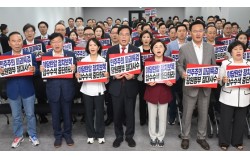 국민의힘 송언석 비상대책위원장 겸 원내대표를 비롯한 당 관계자들이 14일 서울 여의도 중앙당사에서 열린 긴급의원총회에서 전날 김건희 특검의 당사 압수수색과 관련한 규탄 구호를 외치고 있다. 연합뉴스 국민의힘은 14일 긴급의원총회를 열고 전날 김건희 특검팀(특별검사…