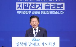 정청래 더불어민주당 대표가 8일 오전 국회에서 기자회견을 하고 있다. 장진영 기자 정청래 더불어민주당 대표는 8일 6·3 지방선거에서 전략공천을 하지 않겠다고 재차 밝혔다. 정 대표는 이날 국회에서 당 대표 취임 후 두 번째 기자회견을 열고 "6·3 지방선거…