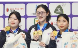 14일(현지시간) 이집트 카이로 국제올림픽시티사격장에서 열린 2025 국제사격연맹(ISSF) 세계선수권대회 여자 25m 권총 단체전에서 우승한 오예진(왼쪽부터), 양지인, 남다정이 시상식에서 메달을 들어보이고 있다. [사진 대한사격연맹] 한국 사격대표팀이 2025…