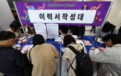 30일 서울 영등포구 영등포아트홀에서 열린 ‘2025 희망·행복·미래 취업박람회’에서 구직자들이 이력서를 작성하고 있다. 이날 금융·병원·산후관리·고객 상담 등 23개 구인 기업이 1대 1 면접을 통해 270여 개 일자리에 대한 현장채용을 진행했다.