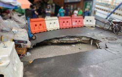 12일 오전 부산 사상구 새벽시장 정만 앞 도로에 세로 5m, 가로 1m 크기의 대형 땅 꺼짐(싱크홀) 현상이 발생해 접근이 통제되고 있다. 싱크홀이 발생한 지점은 부산도시철도 사상~하단선 공사 현장 부근이다. 연합뉴스 12일 오전 11시 5분께 부산 사…
