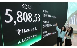 코스피가 5800선을 돌파한 20일 서울 중구 우리은행 딜링룸에 종가가 보이고 있다. 코스피는 전 거래일(5677.25)보다 131.28포인트(2.31%) 오른 5808.53에, 코스닥 지수는 전 거래일(1160.71)보다 6.71포인트(0.58%) 하락한 1154.0…