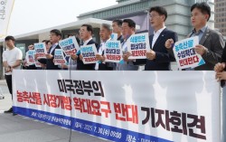“미국은, 트럼프 대통령은 폭력적인 통상 압력을 중단하라!” 미국의 상호관세 부과 유예 시한을 이틀 앞둔 30일 서울 광화문 미국 대사관 앞에선 ‘미국 정부의 농축산물 수입 확대 요구’를 규탄하는 구호가 울려 퍼졌다. 더불어민주당 전국농어민위원회(위원장 임미애 의…