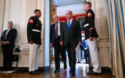 도널드 트럼프 미국 대통령과 베냐민 네타냐후 이스라엘 총리가 지난달 29일(현지시간) 백악관 국빈 만찬장에서 공동 기자회견을 마친 뒤 문을 나서고 있다. [AFP=연합뉴스] 도널드 트럼프 미국 대통령이 지난달 29일(현지시간) 이스라엘과 팔레스타인 무장 …