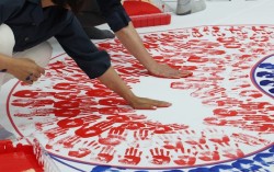 제80주년 광복절을 한 달 앞둔 15일 오후 경기 수원시 권선구청에서 구청 공무원 및 보훈단체 관계자, 권선구 리틀야구단 선수 등 참가자들이 손도장을 찍어 태극기를 만들고 있다. 뉴스1 행정안전부는 광복 80주년을 맞아 오는 8월 15일 ‘제80주년 광복절 경축식…