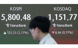 20일 서울 중구 하나은행 본점 딜링룸 현황판에 코스피, 코스닥 지수가 표시돼 있다. 코스피 지수는 이날 장중 한때 5800선을 돌파했다. 연합뉴스 코스피가 장중 한때 5800선을 처음으로 돌파하며 사상 최고치를 다시 썼다. 간밤 뉴욕 증시가 하락 마감했음에도 국…