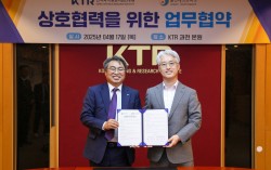 KTR 김현철 원장(왼쪽)이 울산테크노파크 조영신 원장과 상호 협력을 위한 업무협약을 체결했다. KTR(한국화학융합시험연구원, 원장 김현철)이 울산 지역 산업 경쟁력 강화를 돕기 위해 울산테크노파크와 손을 잡았다. KTR 김현철 원장은 17일 KTR…