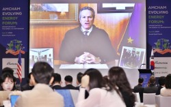 18일 서울 용산구 그랜드하얏트서울에서 열린 암참 에너지 혁신 포럼에서 마이크 던리비 알래스카 주지사가 영상으로 환영사를 하고 있다. 연합뉴스 마이크 던리비 미국 알래스카 주지사가 18일 “알래스카 액화천연가스(LNG) 프로젝트가 한·미 관계를 더욱 강화할 것이라…