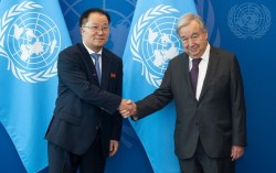 유엔총회 참석차 미국 뉴욕을 방문 중인 김선경 북한 외무성 부상이 29일(현지시간) 미국 뉴욕 유엔본부에서 안토니우 구테흐스 유엔 사무총장과 면담하며 기념촬영하고 있다. 사진 유엔 유엔총회 참석차 미국 뉴욕을 방문한 김선경 북한 외무성 부상이 29일(현지…