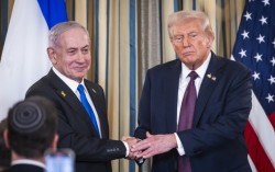 도널드 트럼프(오른쪽) 미국 대통령이 29일(현지시간) 미국 워싱턴 DC 백악관 국빈 만찬장에서 열린 기자회견에서 베냐민 네타냐후 이스라엘 총리와 악수하고 있다. 두 사람은 이날 트럼프 대통령이 마련한 '가자지구 평화구상'을 실행하기로 합의했다. EPA=연합뉴스 …