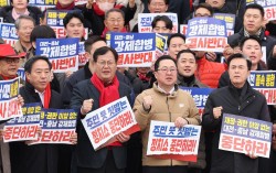 김태흠 충남지사와 이장우 대전시장은 ‘충남·대전통합특별시 통합법안’ 보류와 관련, “법안을 철회하고, 분권 취지에 맞는 새로운 법안을 만들어 추진해야 한다”고 밝혔다. 김태흠 충남도지사와 이장우 대전시장 등이 24일 서울 국회 본관 앞에서 열린 대전·충남 졸속 통합 반…