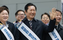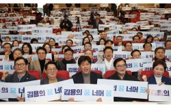 김용 전 민주연구원 부원장이 12일 국회 의원회관에서 열린 자신의 저서 『대통령의 쓸모』 출판기념회에서 우원식 국회의장 등 참석자들과 함께 구호를 외치고 있다. 앞줄 왼쪽부터 송영길 소나무당 대표, 박지원 더불어민주당 의원, 김 전 부원장, 우 의장, 이언주 더불어민주…
