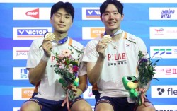 28일 2025 세계배드민턴연맹(BWF) 월드 투어 코리아오픈 남자복식 결승전에서 우승을 차지한 김원호(왼쪽), 서승재. [뉴시스] 한국 배드민턴이 안방에서 열린 국제대회에서 금메달 2개를 수확했다. 남자복식 세계 1위 서승재(28)-김원호(26·이…
