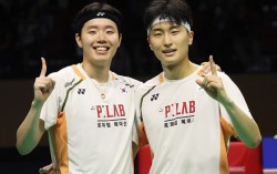 코리아오픈 남자복식 우승 직후 세리머니하는 서승재(왼쪽)-김원호 조. 연합뉴스 한국 배드민턴이 안방에서 열린 국제대회에서 금메달 2개를 수확했다. 남자복식 세계 1위 서승재(28)-김원호(26·이상 삼성생명) 조는 28일…