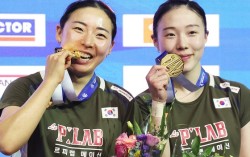 배드민턴 월드 투어 코리아오픈 여자복식 정상에 오른 김혜정(오른쪽)이 시상식에서 파트너 공희용과 함께 금메달을 들어보이며 활짝 웃고 있다. 연합뉴스 코리아오픈에서 2년 연속 여자복식을 제패한 김혜정(삼성생명)이 홈팬들의 뜨거…