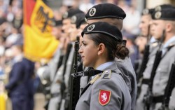 한 무장한 여군이 지난 4일(현지시간) 독일 뒤셀도르프의 노르트라인베스트팔렌 주 의회 앞에서 독일군 분데스베어 신병들이 선서식에 참석하는 모습을 지켜보고 있다. AP=연합뉴스 ‘여성 징병제’가 전 세계적으로 뜨거운 논쟁의 중심에 섰다. 중동 전쟁과 우크라…