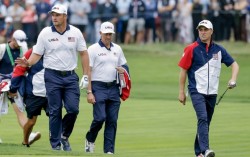 라이더컵 미국팀의 첫 경기 주자로 나설 브라이슨 디섐보(왼쪽)와 저스틴 토마스(오른쪽). EPA=연합뉴스 미국과 유럽의 남자 골프 대항전 라이더컵 첫날 나란히 LIV 골프 무대에서 활약 중인 브라이슨 디섐보(미국)와 욘 람(스…