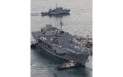 미 해군 제7함대사령부의 상륙지휘함인 ‘블루리지함’(LCC-19·1만9600t)이 25일 오전 부산 해군작전기지에 입항하고 있다. 블루리지함은 길이 194m, 폭 33m에 달하며 약 1000명의 승조원이 탑승할 수 있다.