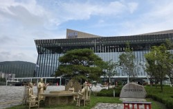경북 경주화백컨벤션센터(HICO) 앞엔 신라 화백회의를 재현한 동상이 설치돼 있다. 심석용 기자 25일 오전 10시쯤 경북 경주시 경주화백컨벤션센터(HICO). ‘APEC 2025 KOREA’라고 적힌 하트 모양 조형물을 바라보며 출입구로 들어서자 금빛 …