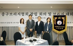 중구브리지협회 창립 기념 대회가 24일 반얀트리 서울에서 열렸다. 발족식에서 기념사진을 찍은 김경희 서울시중구체육회 부장, 김성범 서울시체육회 부회장, 김혜영 한국 브리지협회 회장, 오혜민 서울브리지협회장, 전상균 중구브리지협회(왼쪽부터). 사진 한국브리지협회 …