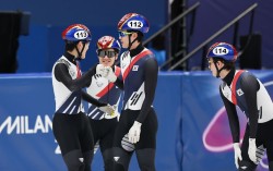 쇼트트랙 임종언(113), 이준서(112), 신동민(114), 이정민(111)이 16일(현지시간) 이탈리아 밀라노 아이스스케이팅 아레나에서 열린 2026 밀라노 코르티나담페초 동계올림픽 쇼트트랙 남자 5000m 계주 준결승에서 결승행을 확정 지은 후 하이파이브를 하고 …