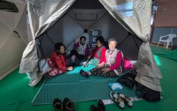 23일 오후 경남 함양군 유림면어울림체육관에 마련된 구호텐트에 80~90대 할머니들이 대피해 있다. 이곳에는 지난 21일 함양군 마천면에서 발생한 산불로 대피한 5개 마을 주민 130여명이 머물고 있다. 안대훈 기자 “겁이 나서 후다닥 나온다꼬 보따리도 몬 쌌지. 몸…