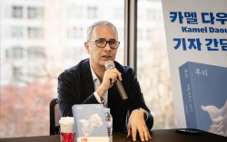 카멜 다우드는 내전 기간 언론인으로도 활동했다. 그는 "나는 답을 알 수 없을 때 소설을 쓴다"며 "내전 당시 학살이 일어난 장소에 가면 신발에 사람의 살이 붙는다. 이걸 어떻게 말로 표현하고 답을 내릴 수 있을까"라고 했다. 사진 민음사 한강 작가와 비교되는 것은 …