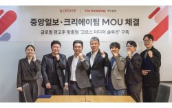 중앙일보와 크리에이팁이 글로벌 광고주 맞춤형 ‘크로스 미디어 솔루션’ 구축을 위한 업무협약을 5일 체결했다. 왼쪽부터 이유경 크리에이팁 퍼포먼스광고팀장, 하만준 크리에이팁 경영지원팀장, 강경록 크리에이팁 부대표, 박천우 중앙일보 비즈솔루션본부장, 김세진 중앙일보 마케팅…