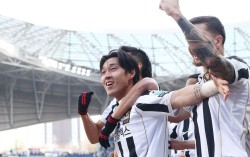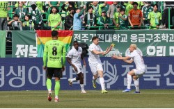 디펜딩 챔피언 전북을 상대로 득점하고 기뻐하는 부천 선수들. 뉴스1 '승격팀' 부천FC가 프로축구 K리그1(1부) 데뷔전에서 디펜딩 챔피언 전북 현대를 무너뜨렸다. 이영민 감독이 이끄는 부천은 1일 전주월드컵경기장에서 열린 2026시즌 K리그1 1라…