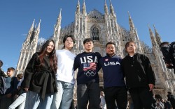 이탈리아 밀라노 대성당 앞에서 포즈를 취하고 있는 미국 쇼트트랙 국가대표 앤드류 허(가운데)의 가족들. 왼쪽부터 형수 에이프릴 신, 형 애런 허, 아버지 허덕진, 어머니 김혜영. 막내아들의 2026 밀라노·코르티나담페초 동계올림픽 출전을 응원하기 위해 외삼촌 내외까지 …