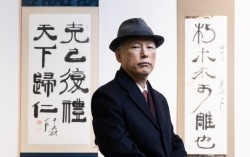 3일 서울 인사아트프라자의 김병기 전북대 명예교수. 전시작 중 한 구절로 『논어』 공야장'편의 ‘후목불가조야(朽木不可雕也·오른쪽)’를 꼽았다. ‘썩은 나무엔 새길 수 없다’는 의미다. 권혁재 사진전문기자 썩은 나무엔 새길 수 없다(朽木不可雕也) 3일 서울 인…