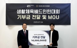 경상북도배드민턴협회 김병근 부회장(왼쪽), 열정국밥 문준호 총괄이사(오른쪽) 열정국밥(대표 전경훈)이 경상북도배드민턴협회(협회장 오종환)와 지난 4일 열정국밥 본사에서 ‘제9회 경상북도협회장기 생활체육배드민턴대회’ 지원을 위한 기부금 전달 및 MOU를 체…