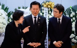 지난달 30일 오후 서울 종로구 서울대학교병원 장례식장에 마련된 고 이해찬 전 국무총리의 빈소에서 한명숙 전 총리, 정청래 더불어민주당 대표, 유시민 작가가 조문객을 맞이하고 있다. [사진공동취재단] “제가 유시민과 맞짱 한 번 뜰까요” 열린우리당…