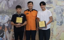 2일 충북 충주소방서는 물에 빠진 노인을 구한 김규민군(17)과 김태환군(15)에게 감사패를 전달했다고 밝혔다. 뉴스1 충북 충주소방서는 신속한 판단으로 물에 빠진 노인을 구한 10대 형제에게 감사패를 수여했다고 2일 밝혔다. 형제 사이인 김규민군(…