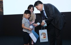 박중신 대한모체태아의학회장(오른쪽)이 학회에 참석한 강병수 서울성모병원 교수(가운데)의 7살 아들에게 표창장과 선물을 전달하고 있다. 지난달 21일 서울대병원 CJ홀. 산부인과 전문의 100여 명이 참석한 대한모체태아의학회 제31차 학술대회 현장에서 이색…
