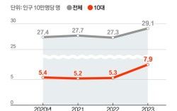 부산 10대 자살률이 역대 최고치를 기록했는데도 부산시가 올해 자살예방 업무 예산을 대폭 삭감한 것으로 나타났다. 30일 부산시에 따르면 올해 부산자살예방센터의 사업 예산은 1억7000만원으로 지난해 2억4000만원보다 7000만원 줄었다. 부산시는 2022~20…