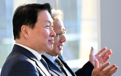 최태원 SK그룹 회장과 젠슨 황 엔비디아 CEO가 지난해 10월 31일 경북 경주시 경주예술의전당에서 열린 아시아태평양경제협력체(APEC) CEO 서밋에서 환담을 나누고 있다. 김성룡 기자 최태원 SK그룹 회장이 젠슨 황 엔비디아 최고경영자(CEO)와 미국 실리콘…