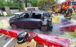 소방대원이 전기차 화재를 진압하고 있다. 사진 경기도소방재난본부 경기 하남시의 한 아파트 지하주차장에서 충전 중이던 전기차에 불이 나 55분 만에 진화됐다. 25일 경기도소방재난본부 등에 따르면 이날 오전 7시 55분쯤 하남시 신장동의 25층짜리 아…