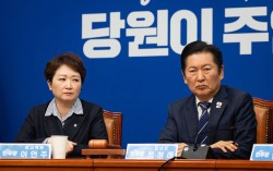 정청래 더불어민주당 대표와 이언주 최고위원이 4일 서울 여의도 국회에서 열린 최고위원회의에서 이성윤 최고위원의 발언을 경청하고 있다. 뉴스1 정청래 더불어민주당 대표가 조국혁신당과 합당을 두고 당내 반발이 커지자 선수(選數)별 연쇄 회동을 통해 ‘도장깨기…
