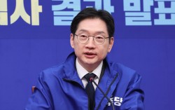 김경수 대통령직속 지방시대위원장이 5일 국회에서 열린 더불어민주당 중앙당공천관리위원회 공천 심사 발표에서 경남지사 후보로 단수 공천 된 뒤 인사말을 하고 있다. 임현동 기자 더불어민주당이 5일 6·3 지방선거 경남도지사 후보자로 김경수 대통령직속 지방시대위원회 위…