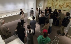 15일(현지시간) 미국 워싱턴 스미스소니언 국립아시아미술관에서 개막한 이건희 회장 기증품 해외 순회전 ‘한국의 보물: 모으고, 아끼고, 나누다’를 안내하는 황선우 KF한국미술문화 담당 큐레이터. 맨 왼쪽은 체이스 로빈슨 관장. 김병기의 ‘산악’ 7폭 연작(맨 오른쪽 그…